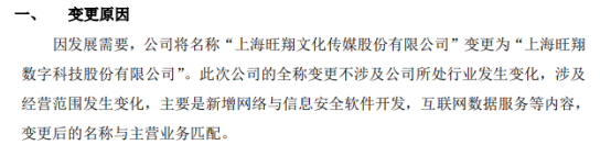 公司已于近日完成变更公司名称的工商变更登记,并取得上海市市场监督管理局核发的《营业执照》。自2022年8月5日起,公司正式在全国中小企业股份转让系统进行名称变更,变更前本公司全称为“上海旺翔文化传媒股份有限公司”,变更后全称为“上海旺翔数字科技股份有限公司”,证券代码保持不变。